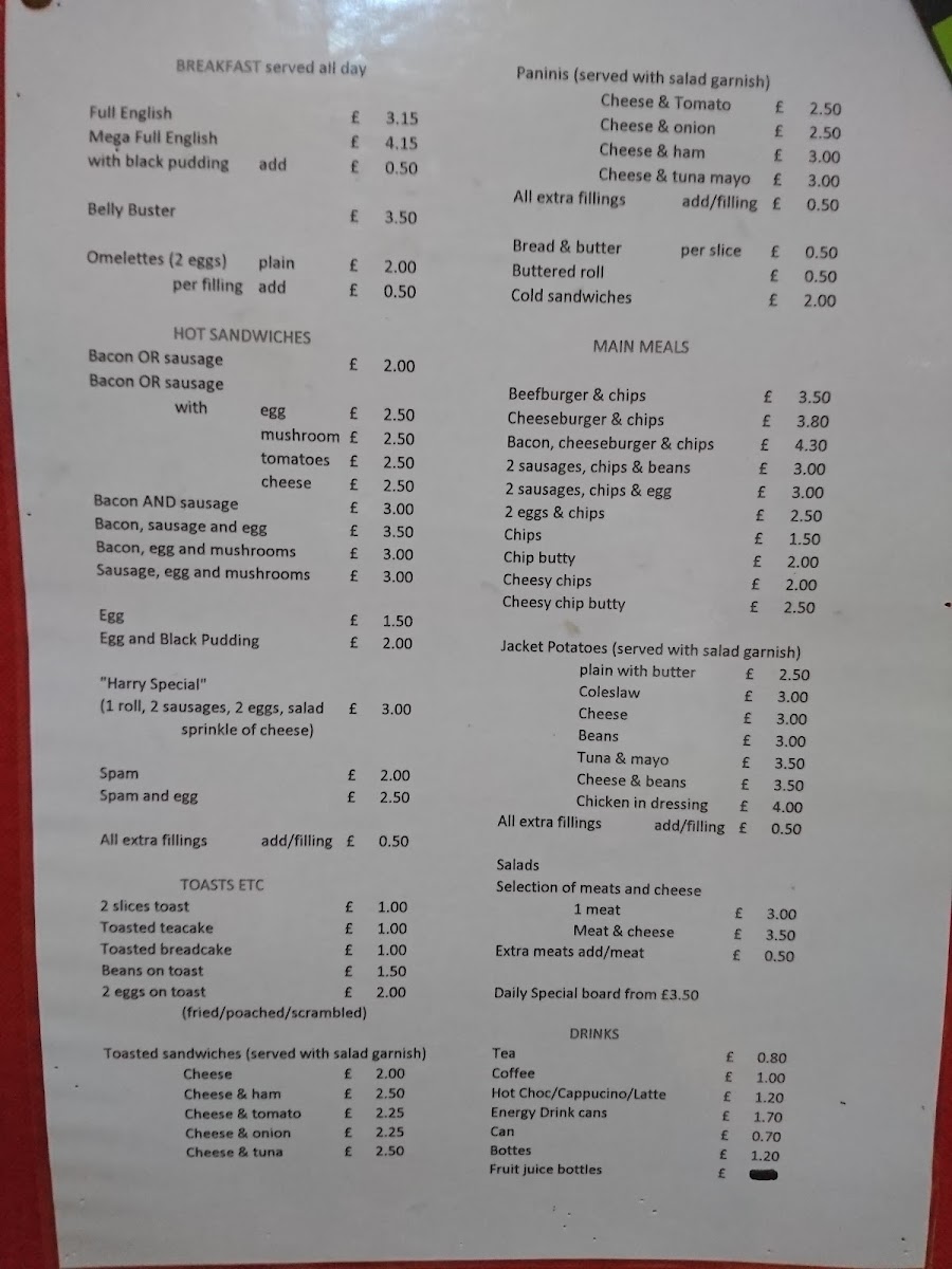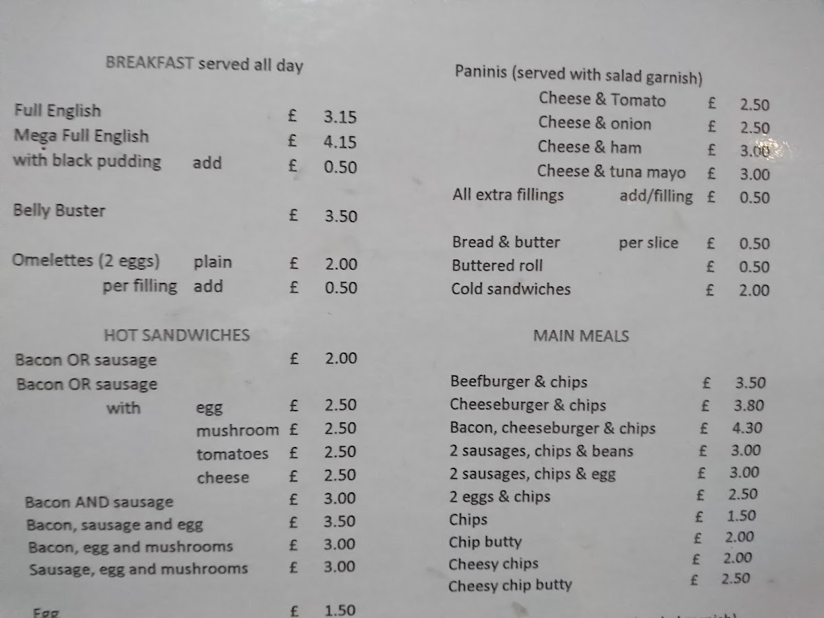 - Paninis and Cold Sandwiches: Toasted panini varieties with fillings like cheese and tomato, cheese and onion, cheese and ham, and cheese with tuna mayonnaise, alongside bread and butter and buttered rolls for cold sandwich options.